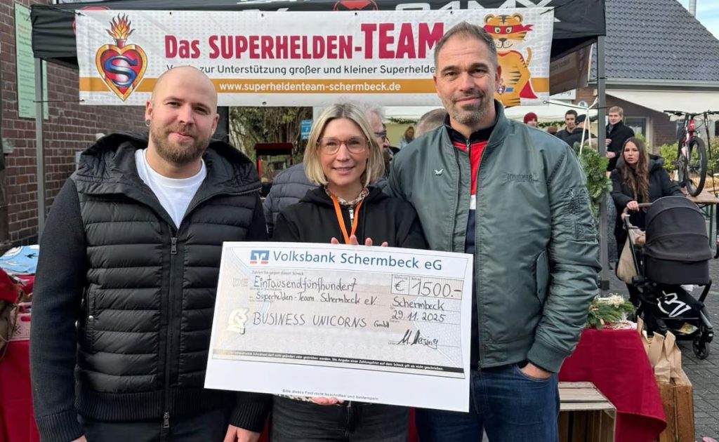 Beim Weihnachtsmarkt der Begegnung in Schermbeck setzte das Softwareunternehmen Business Unicorns aus Reken gleich zum Beginn der Adventszeit ein starkes Zeichen. Geschäftsführer Max Messing überreichte eine Spende in Höhe von 1.500 Euro an das Superhelden-Team Schermbeck. Die symbolische Scheckübergabe fand kurz nach der offiziellen Eröffnung des Marktes statt. Zum weiterlesen hier klicken Foto & Text https://schermbeck-online.de